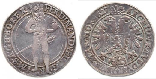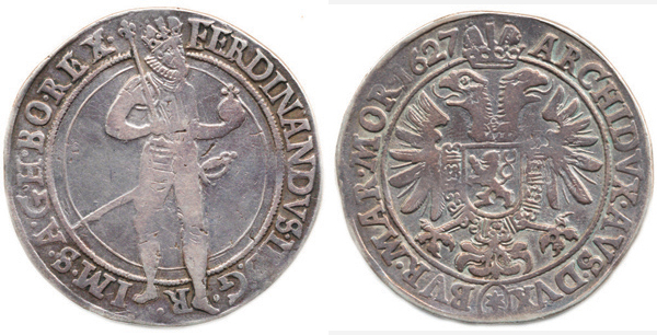Tolar 1627, K.Hora-Hölzl MKČ -, var.: av.: perličkové a hladké okruží / rv.: minc.zn. v oválu, opeřené vysoké krky bez prstenců, opis: BVR.