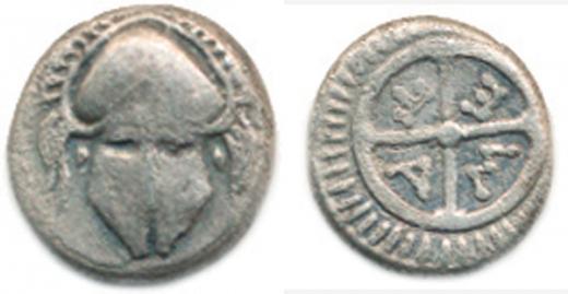 Diobol, přilba s hřebenem zepředu / kolo s písmeny META Sear 1673