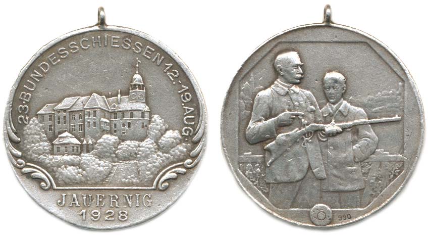 Javorník (Jauering) - 23. spolkové střelby 12.-19.8. 1928, zámek Jánský vrch / střelec s jinochem zprava Ag 990/1000 34 mm 13,76 g ouško "R"