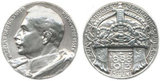 Prusko - Wilhelm II. král Pruska, hlava zleva / 25 let vlády 1888-1913 sign.: Lauer NDG Ag 33 mm 16,89 g