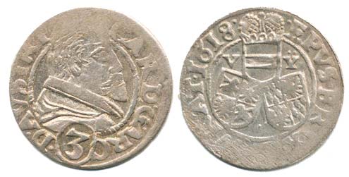 3 kr. 1618 V-"Y, minc. Nisa Kop. neuvádí; publikováno v č asopise Numismatik, ČNS Brno 2005 č.1-4, s. 69