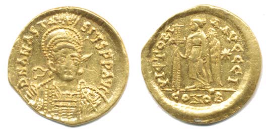 Solidus, stoj. Viktorie zleva drží dlouhý kříž, za ní hvězda VICTORIA AVGGGL, v úseči značka minc. CONOB - Konstantinopol SB 3 4,311 g