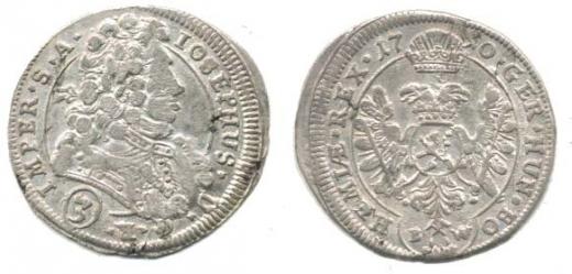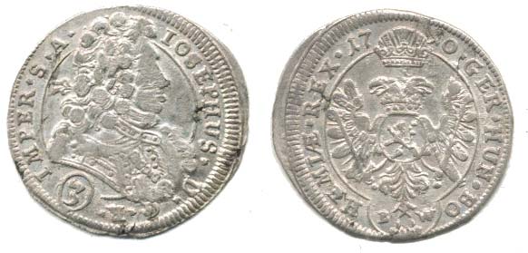 3 kr. 1710 BW, K.Hora-Wohnsiedler jako MKČ 1731, ale opis: IMPER.S.A. -hlava až k okraji mince, jiný prsní štítek_nep. hr.