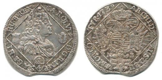 1/4 Tolar 1739 NB, Velká Baňa jako Husz. 1623, opis: CAROL.VI. D:G:R:IMP. S:A:GE:HI. HU:B:REX. / ARCH.D: AUS:D:BU M:MOR.CO. TYR.1739(bez tečky)_kraj. stř., mír. just.