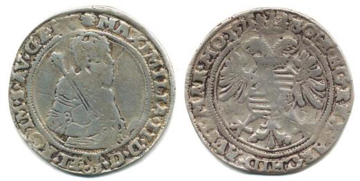 1/2 Tolar 1573, Kutná Hora-Šatný+Vodolínský jako MKČ 196 opis : *MAXIMILLA. II. D.G.() EL. RO. IM. S. AV. GE. HV "RR"