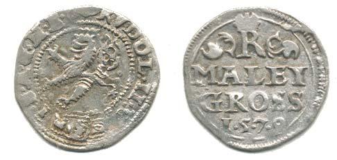 Malý groš 1579, K.Hora-Šatný HN 2b (tečky v dataci 1.5.7.9) opis 7a_v rv. dr. dvojráz
