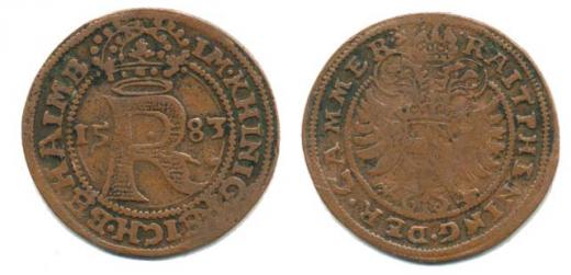 Početní groš 1583, České Budějovice-Schönfeld Mrš. 94a var. : za CAMER kytička, hlavy orlů v kroužcích / hladký a perl. kruh, v písmeně R tečka "R"