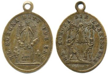 Svatá Corona, nebo také Stephana, patronka před epidemiemi, mučednice z Blízského východu (Sýrie), A: Kostel mezi dvěma stromy, nad ním světice drží květinu a palmovou ratolest / R: Sv. Corona je přivázána mezi dvěma palmami a mučena dvěma vojákymosaz 14x18 mm plochí ouško