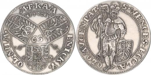 M. F. KAMENICKÝ. OL . NUM., mezi třemi erby Moravy-Slezska-Lašskahouslové klíče a datace 7.7.2013, uprostřed v trojúhelníku čísl."65"/ Stojící sv. Václav drží v pravé ruce praporec, levou se opírá o štít, opis: S.WENCES.ECCLAE.OLOMVCEN.PAT sign.: JJ-ZK (Jelínek-Kaleta) Ag 31 mm 7,21 g /vyd. 21 kusů/
