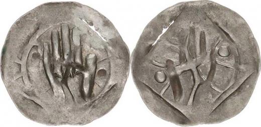 Obchodní haléř ze 14. století, ruka / kříž Sa 1364/607 0,4 0 g_mírně proražen ražbou