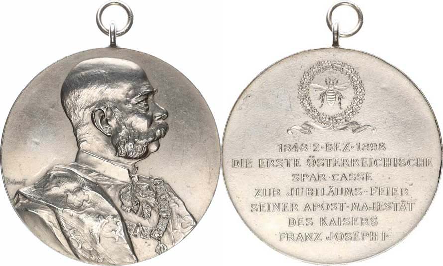 F.J.I., poprsí zprava bez opisu / I. rakouská spořitelna k jubile u císaře 1848 - 1898, včela ve věnci a 7-mi řádk. nápis sign.: A.Scharff postř. bronz 57 mm ouško +závěs