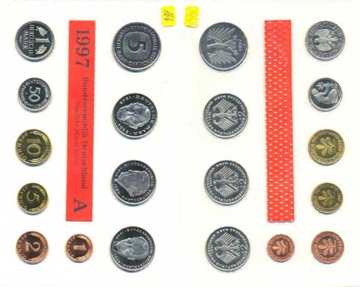 Ročníková sada mincí 1997 minc. A (1, 2, 5, 10, 50 Pf., 1, 5, 2 DM - Eberhart, Strauss, Brandt) 10 ks zataveno v orig. folii mincovny MS 99