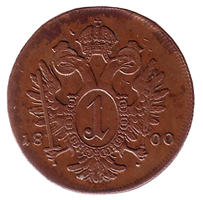 Materiál: Cu, Průměr: 18 mm, Hmotnost: 2 g (ročníky 1801-3, cca 1,4 g)